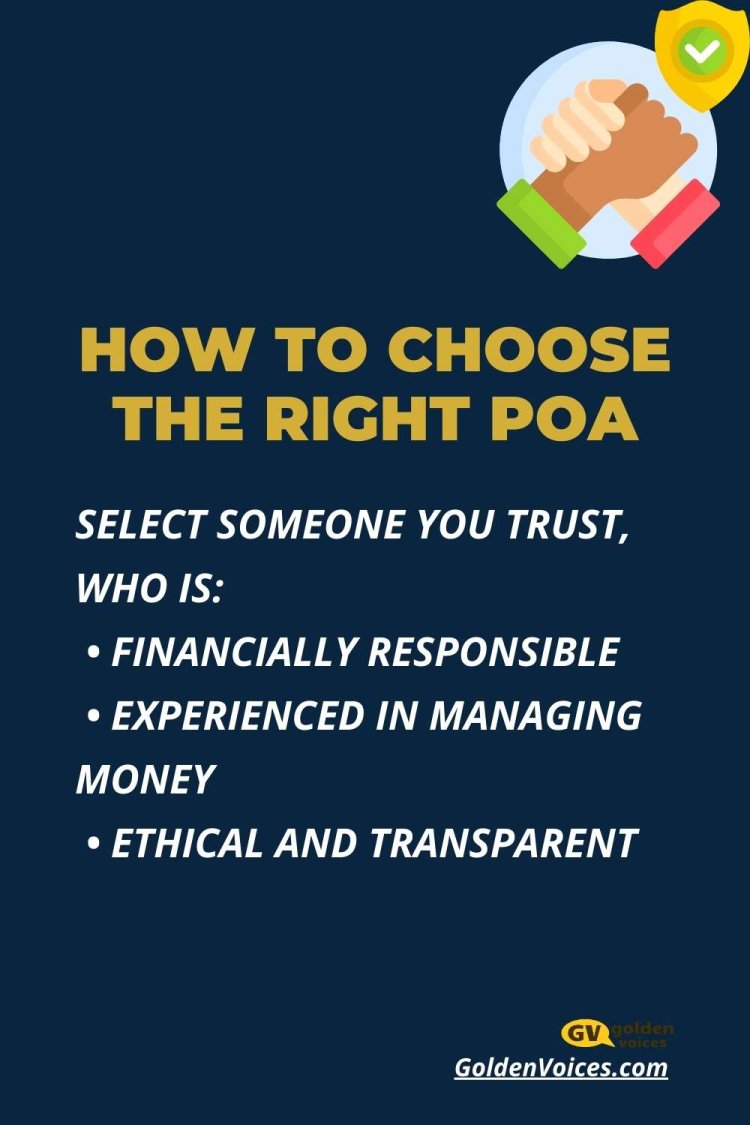 Give your power of attorney to someone close to you who cares about you. This person should be very responsible. For example, someone who pays their bills and taxes on time is a good choice.