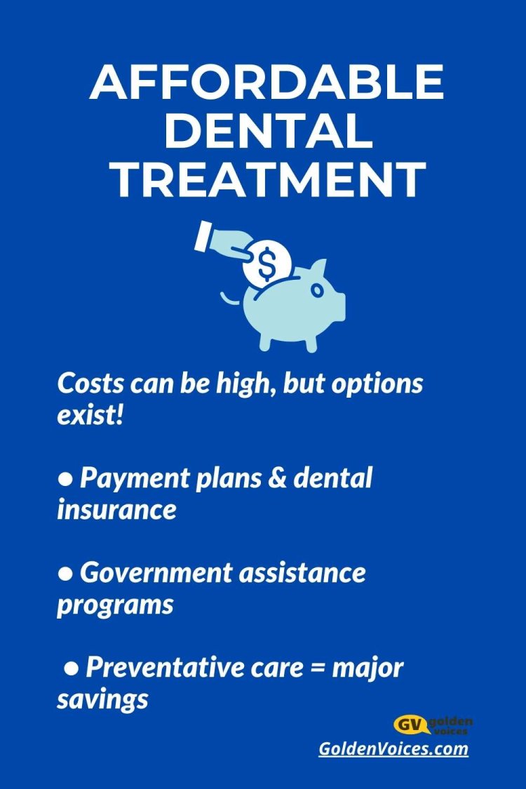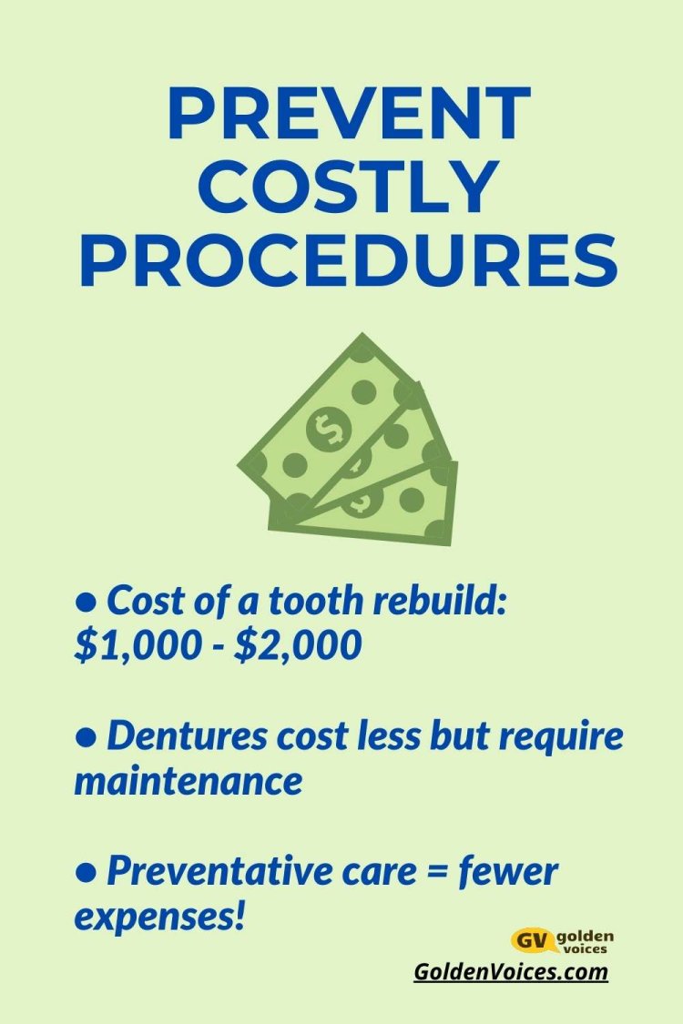 Seniors should try their best to keep their teeth as long as possible through regular dental checkups. Dentures are expensive and cost extra money for maintenance and replacement.