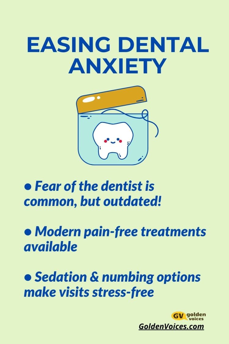Anxiety about going to the dentist is common in seniors. Many have had bad experiences earlier in life with dental care because dentistry was not as advanced when they were growing up as it is now. For example, they may have had a tooth pulled with no freezing.